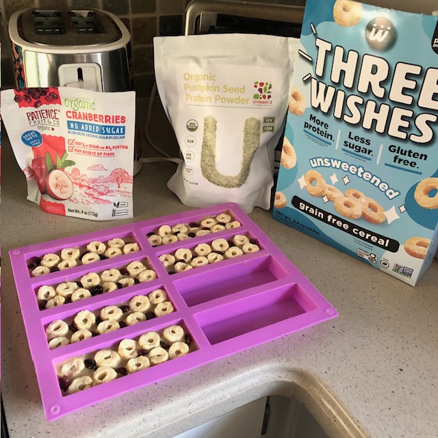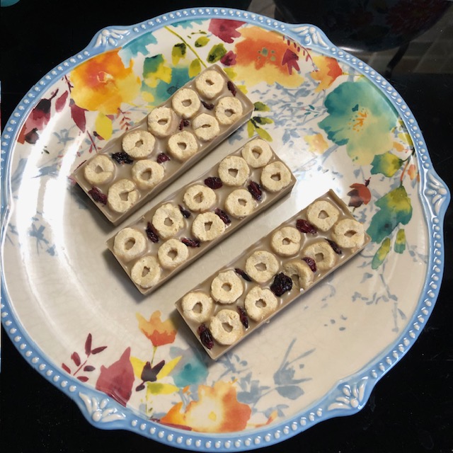 That afternoon, I decided to use what I had to make some keto-friendly treats. I used some cereal my mom had left, as well as other items I had on hand, such as sugar-free white chocolate chips and cranberries. They tasted pretty good! I need to make them with more protein and less fat and carbs next time.
