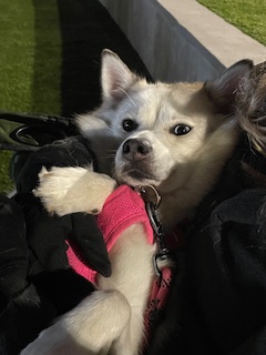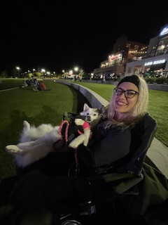 It got COLD outside, and we bundled up to watch a college football game a nearby city center was hosting. I know we have said we wouldn’t be able to have dogs if we were living on a Social Security budget, but they did come with us. Here’s Sunshine on my lap like a little baby (a long baby, as you can see! 😂
